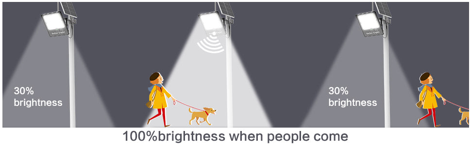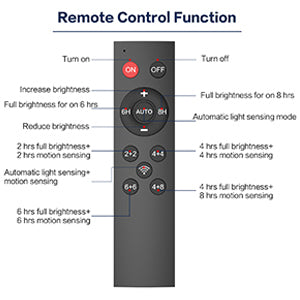 - Remote Control - This solar powered light is controlled by remote control and the remote control distance up to 32.8 ft(10m), for auto modes, motion sensing mode, full bright mode, full bright+motion sensing mode, timing mode.