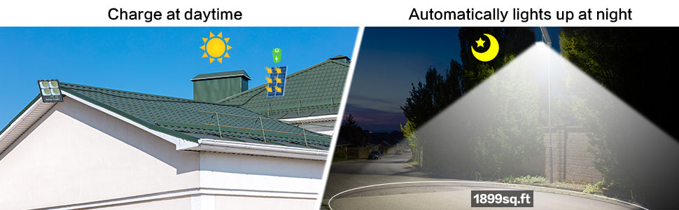 - Continuously illumination whole night: High quality 200W 8000 Lumens 6500k Solar LED Flood Light can illuminate an area of more than 1444 sq ft, like as a sun. 3.2V 20000mAH large capacity battery makes the lamp continue to illuminate for 16 hours(fully charged).
